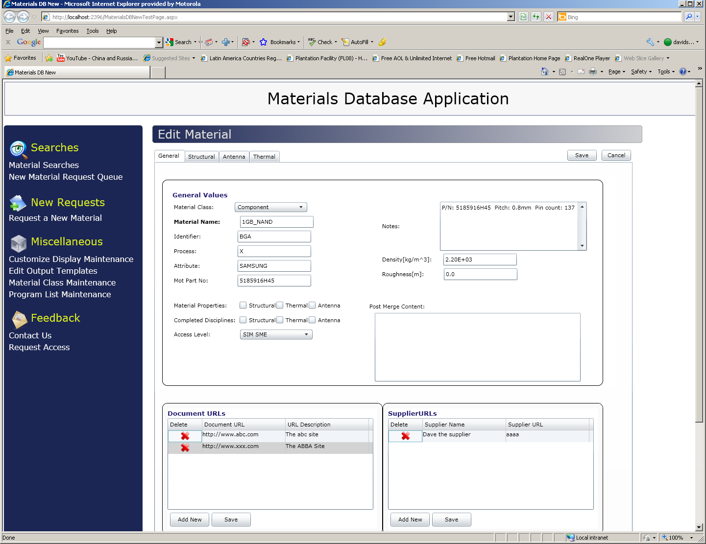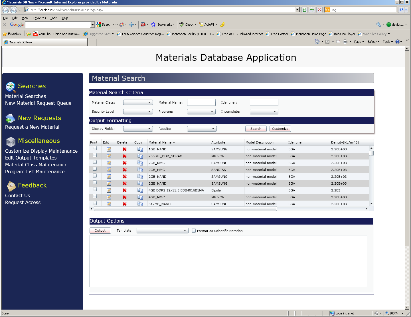 Materials Database is an application used for tracking materials, inventory and scheduling for materials used in Mobile devices. Users can schedule new material requests, search existing materials, define output templates and fully customize any details of a specific material.